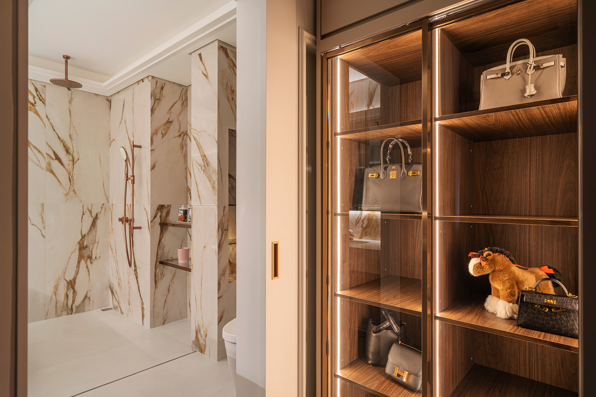 深色胡桃木作為轉場,將視覺引入主浴,主臥浴室以寬闊佈局搭配白金色石紋瓷磚,古銅色Gessi衛浴設備映襯其間,營造出低調卻戲劇性的氛圍,讓生活品味滲透至最細微的日常。