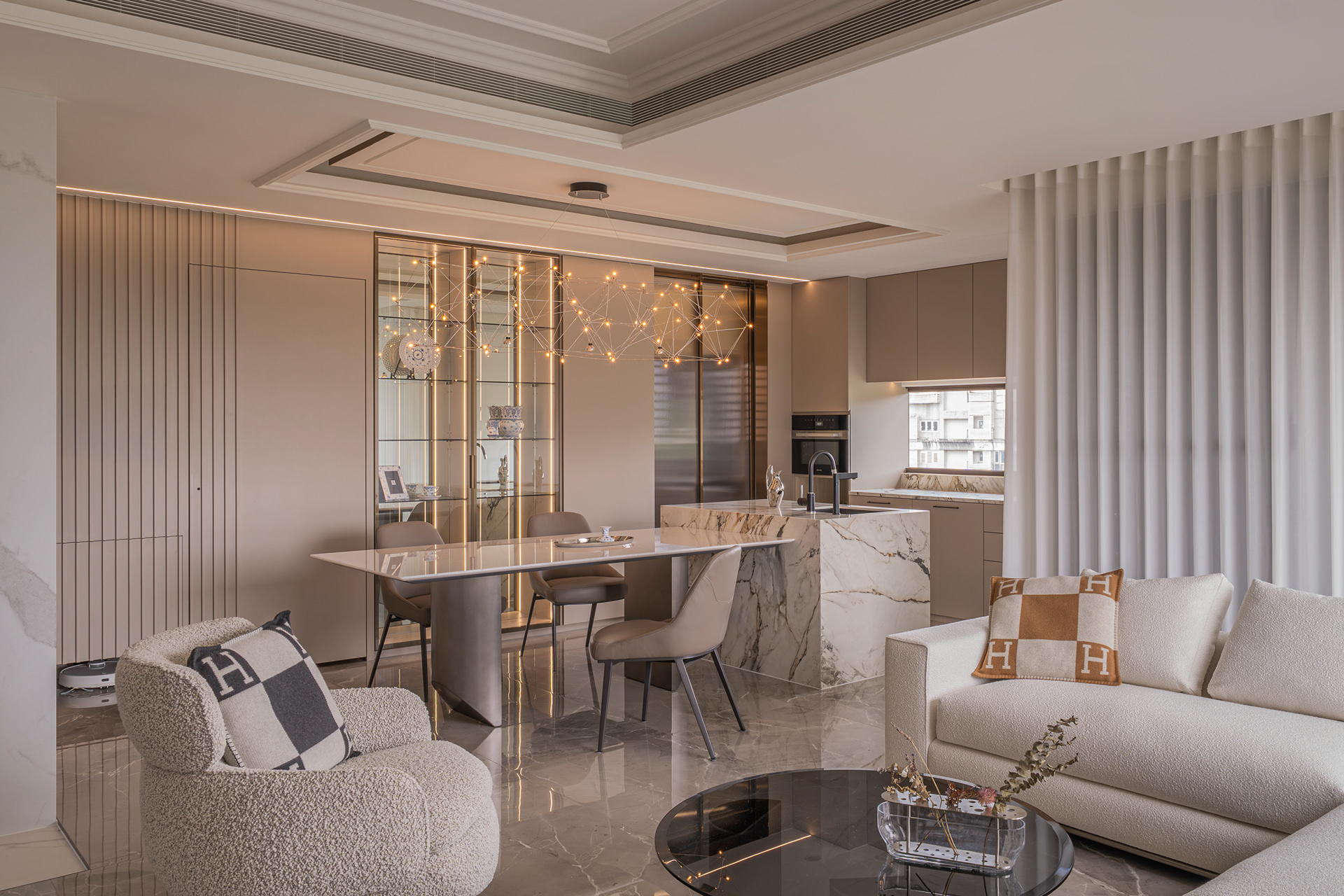 客廳以Minotti 家具展現優雅大器風範,白色石材與暖灰色塊低調勾勒輪廓,開放式布局將客廳、餐廳與廚房無縫串聯,中島的華美石成為視覺停駐點,用餐區端景由瑪瑙石紋立面與玻璃展示櫃構成,收藏的瓷器在Quasar吊燈的星光映照下,靜靜訴說歲月與品味,氛圍細膩而深邃。