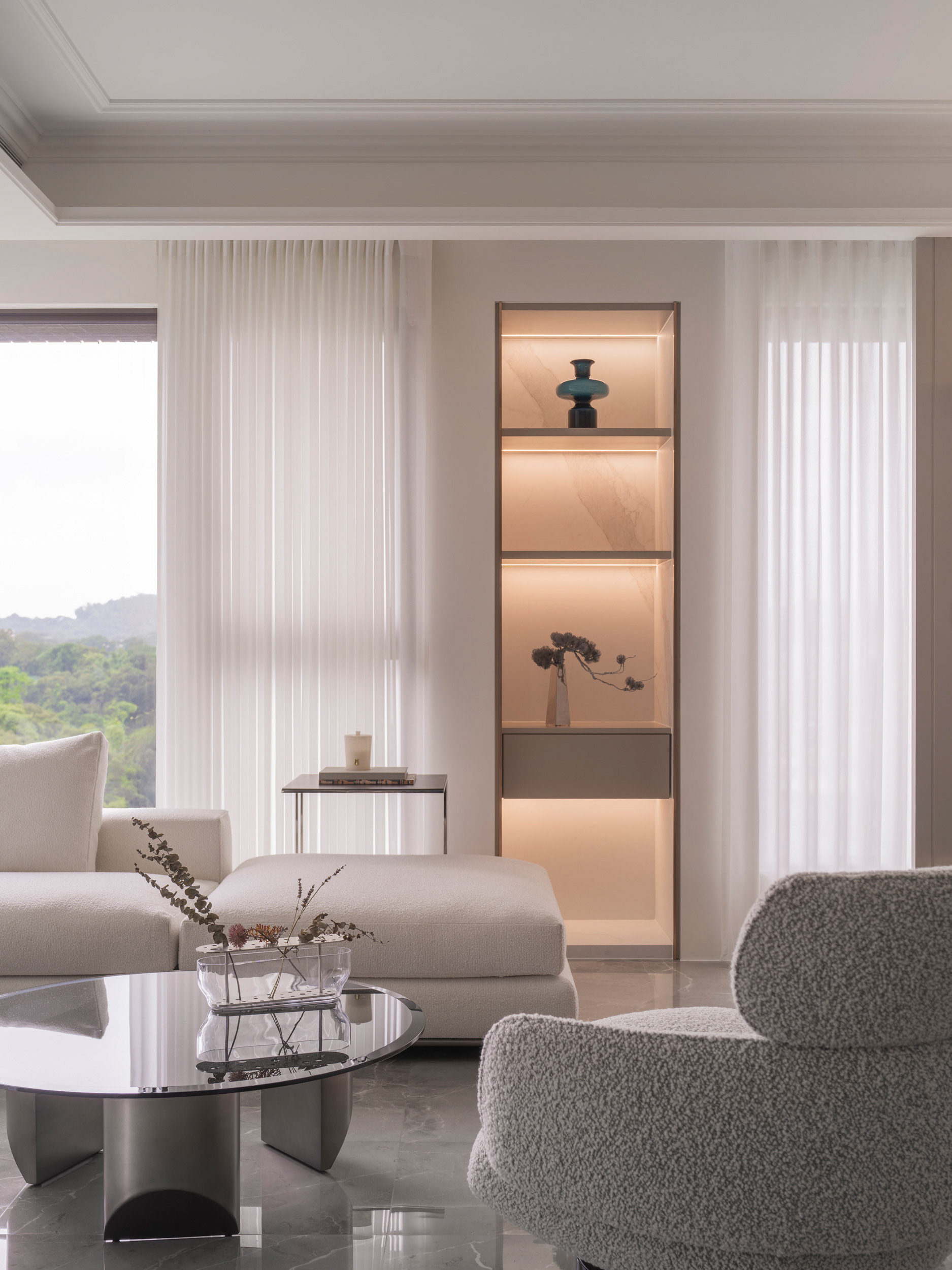 原本的狹長格局限制了空間的呼吸,設計師以精準的重構策略,拆解並重組每一條視線與動線,讓自然景致與生活情境在同一條軸線上對話。
