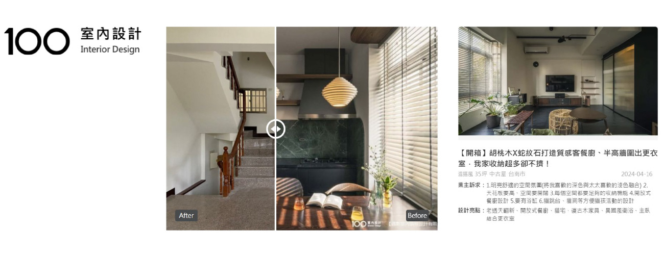 100 室內設計 / 【開箱】胡桃木X蛇紋石打造質感客餐廚、半高牆圍出更衣室,我家收納超多卻不擠!